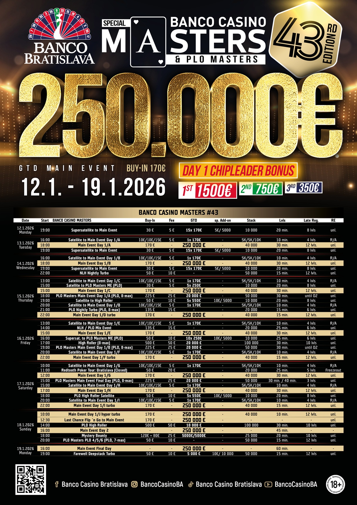 Banco Casino Masters láká hráče na svou garanci 250.000€ a Chipleader Bonus, který zajišťuje pro první tři hráče na chipech každého flightu až 2.600€. Úvodní hrací dny odstartovaly už v úterý 13. ledna a budou pokračovat podle plánu až do neděle 18. ledna. Do Day 2 postoupí vždy 10% hráčů z počtu entries a každý, kdo postoupí, se automaticky ocitne na penězích.