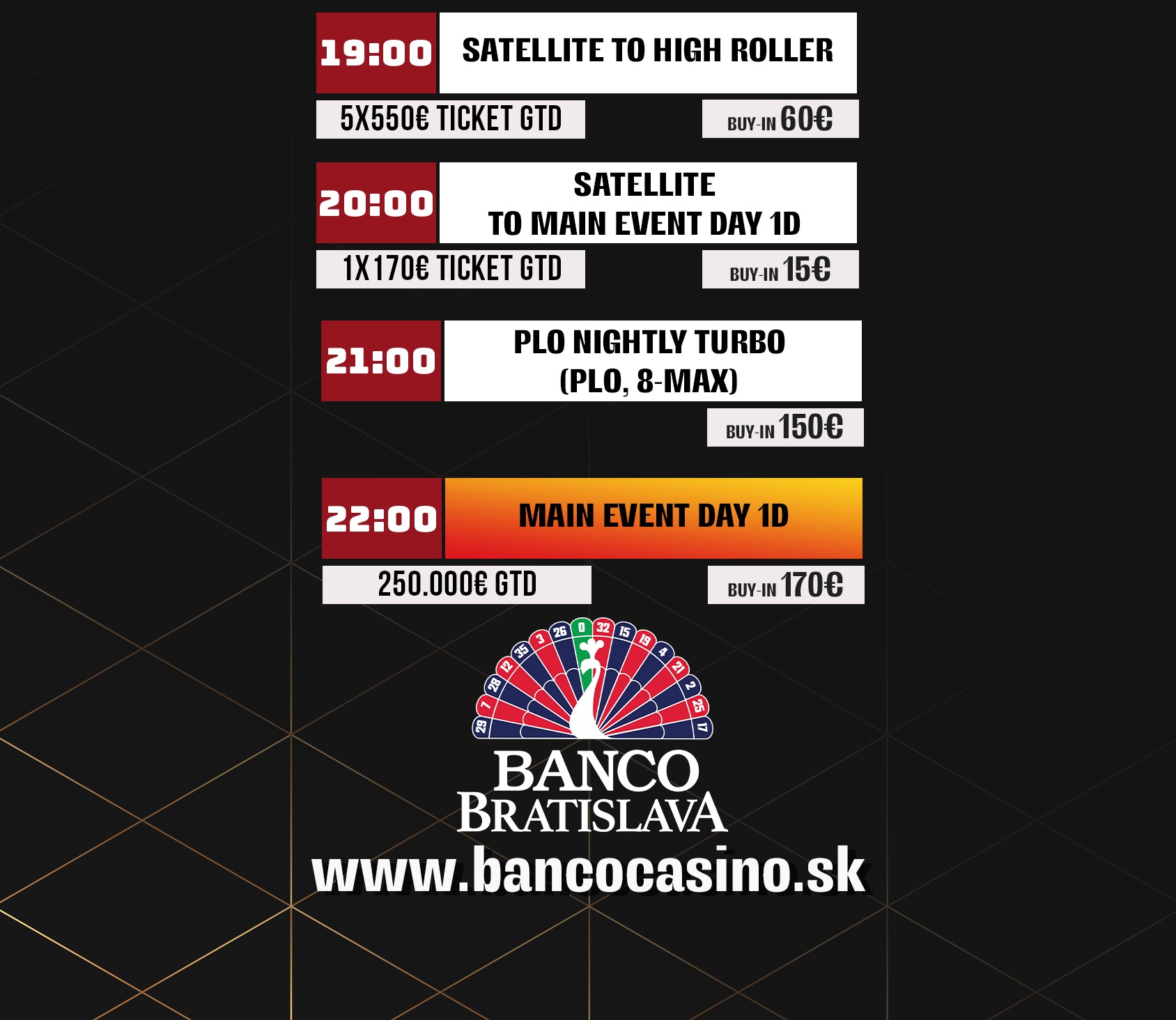 Dnes budou na programu dva flighty Main Eventu s garancí 250.000€ a buy-inem 170€. První z dvojice začne v 15:00 hodin a druhý s Turbo strukturou ve 22:00 hodin.