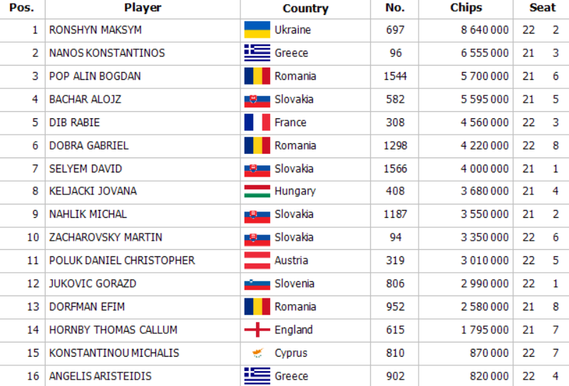 Trvalo několik hodin, než se sformovala finálová sestava, v níž se chipleaderem stal ukrajinský hráč Maksym Ronshyn se stackem 8 640 000 žetonů. Mezi elitou se ocitla také čtveřice domácích hráčů: Alojz Bachar, David Selyem, Michal Náhlik a Martin Zacharovský.
