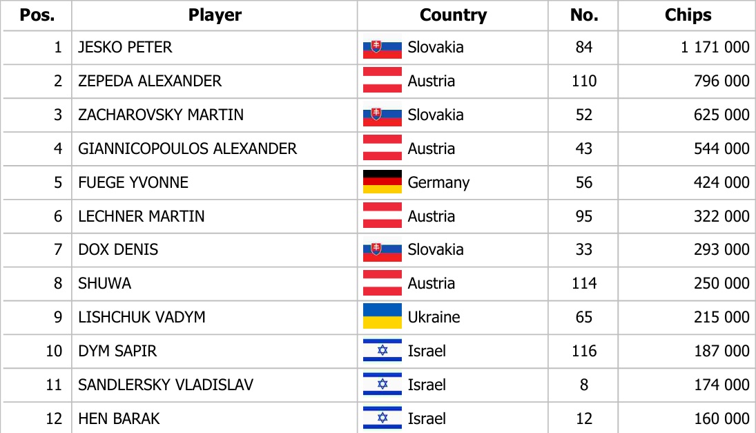 Boj o 42. titul odstartoval už včera otevíracím dnem 1A, kde bylo zaregistrováno 129 entries. Z nich jsme při 10% postupu poznali 13členné pole postupujících. Největší stack si zabalil domácí hráč Peter Ješko a k tomu získal ještě chipleader bonus 1.500€!