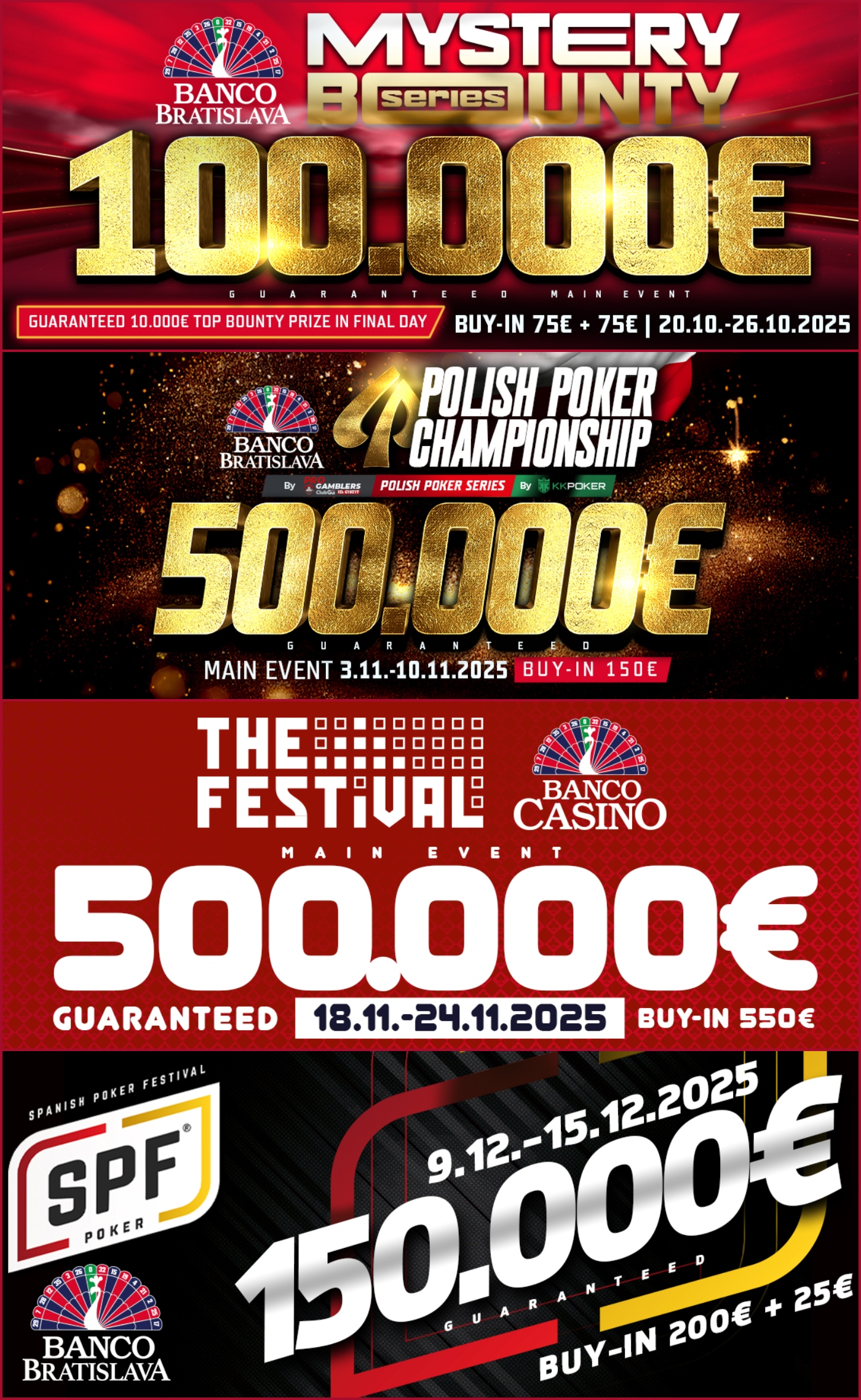 Banco do konce roku 2025 přinese extrémní akce jako Polské Mistrovství v pokeru s garancí 500.000€ za 150€ vstupné, The Festival s neuvěřitelným harmonogramem a Main Eventem 500.000€ GTD za 550€ či Spanish Poker Festival s garancí 150.000€.