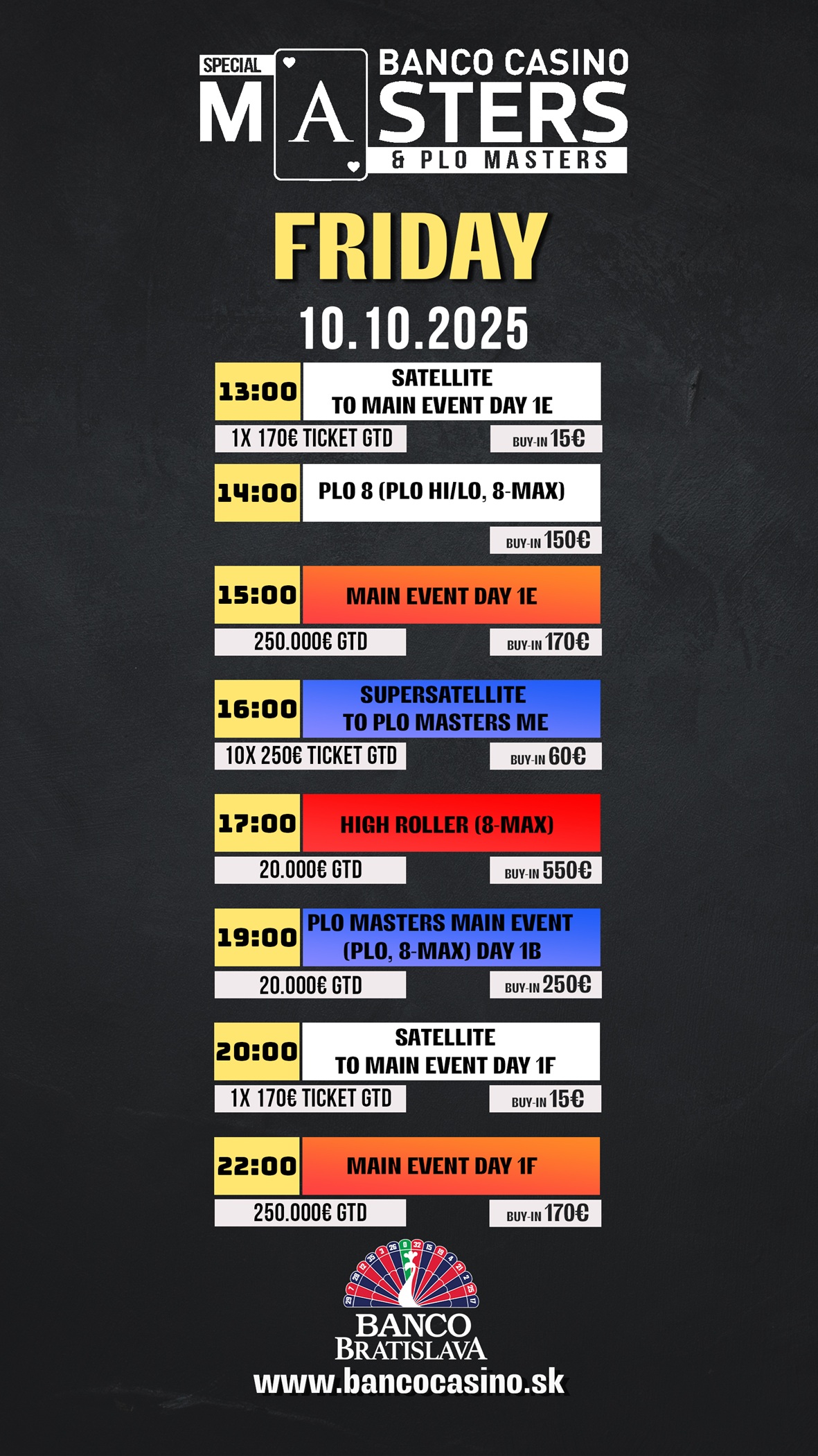Dnes to bude v Banco Bratislava doslova vřít. Množství akce pro pokerové hráče přinesou dva flighty Main Eventu s garancí 250.000€ spojené s chipleader bonusy. PLO Masters 20.000€ GTD bude pokračovat druhým flightem a pro ty nejodvážnější bude připraven i High Roller s garancí 20.000€.