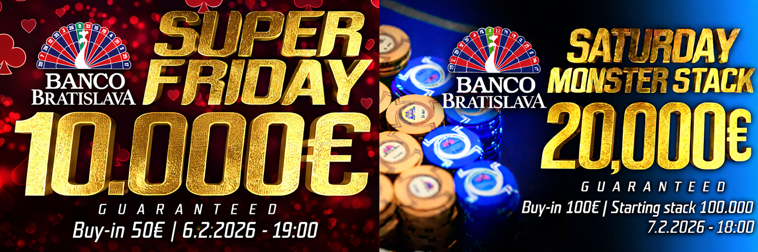 Nabitý program Banco Bratislava na únor přiláká do hlavního města Slovenska mnoho pokerových hráčů především ze zemí Evropy, a stane se tak epicentrem evropského pokeru. Před velkými událostmi jako Cash Game Tour, Winter Polish Poker Cup a The Festival, si můžete užít poker během jednodenních turnajů. Nebude chybět Ladies Night, kvalifikace na Slovak Poker Open, či během nejbližšího víkendu Super Friday a Saturday Monsterstack.
