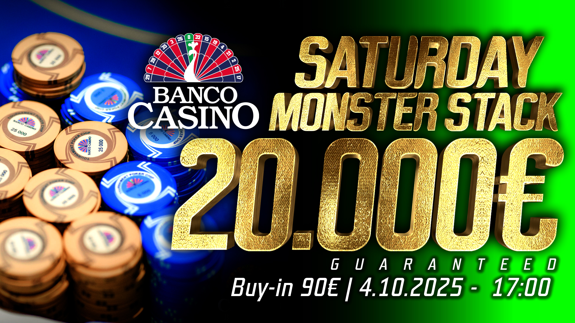 POZOR SOUTĚŽ: Ve spolupráci s Banco Bratislava jsme pro vás připravili soutěž o 5 x 45€ slevu na sobotní Saturday Monsterstack, díky které si o 20.000€ garanci můžete zahrát za pouhých 45€. Pro zapojení do soutěže stačí dát like na soutěžní post na našem FB, mít like na stránce Banco Bratislava a v komentáři označit jednoho kamaráda, s kterým byste si chtěli zahrát turnaj. Ukončení soutěže bude v sobotu ve 12:00, kdy vyhlásíme jména výherců. Hodně štěstí!