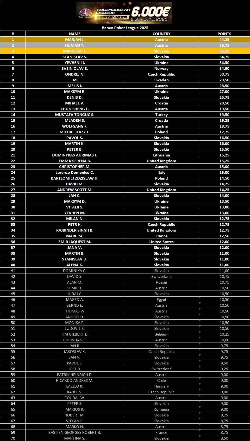 Výhry z Banco Casino Bratislava Poker League čekají na své majitele. Už tento týden se dozvíme, kdo si odnese odměny ze 6.000€ balíku. Do ligy se započítají už jen poslední čtyři turnaje, mezi které patří i páteční Ladies Night a sobotní Saturday Monsterstack s garancí 20.000€. Aktuální pořadí si můžete prohlédnout níže.