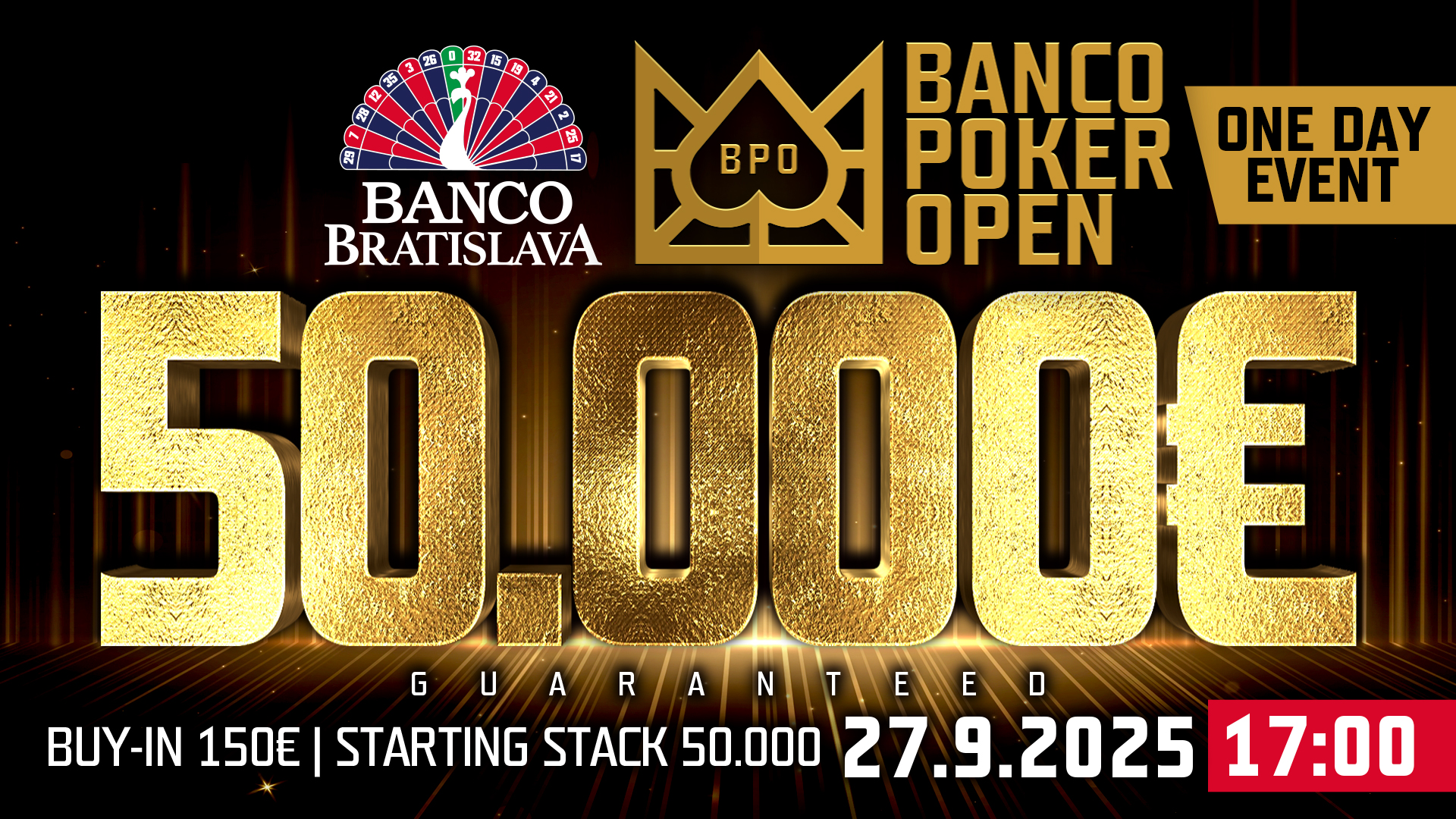 POZOR SOUTĚŽ: Ve spolupráci s Banco Bratislava jsme pro vás připravili soutěž o 3 x 75€ slevu na sobotní Banco Poker Open turnaj, díky které si o 50.000€ garanci můžete zahrát jen za vstupních 75€. Pro zapojení do soutěže stačí dát like na soutěžní příspěvek na našem FB, mít like na stránce Banco Bratislava a v komentáři označit jednoho kamaráda, se kterým byste chtěli tento turnaj hrát. Konec soutěže bude v sobotu ve 12:00, kdy vyhlásíme jména vítězů. Hodně štěstí!
