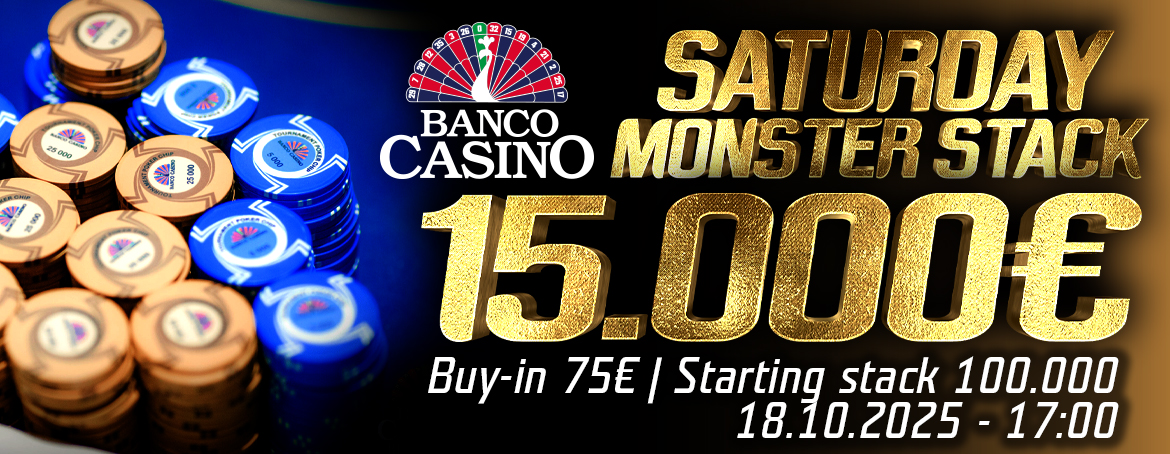 POZOR SOUTĚŽ: Ve spolupráci s Banco Bratislava jsme si pro vás připravili soutěž o 3 x 40€ slevu na sobotní Saturday Monsterstack turnaj, díky které si o 15.000€ garanci můžete zahrát jen za vstupních 35€. Pro zapojení do soutěže stačí dát like na soutěžní příspěvek na našem FB, mít like na stránce Banco Bratislava a do komentáře označit jednoho kamaráda, se kterým byste si tento turnaj chtěli zahrát. Ukončení soutěže bude v sobotu ve 12:00, kdy vyhlásíme jména výherců. Hodně štěstí!