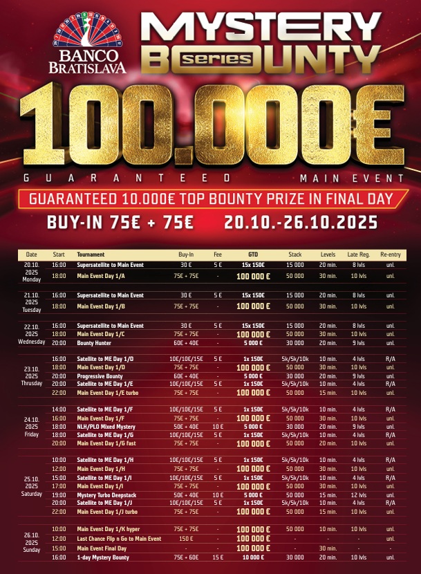 Banco Bratislava do konce roku 2025 přinese extrémní akci jako Polské Mistrovství v pokeru s garancí 500.000€ za 150€ vstupné, The Festival s neuvěřitelným harmonogramem a Main Eventem 500.000€ GTD za 550€ a Spanish Poker Festival od 9.12. do 15.12.