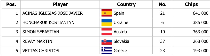 Pomalý úvod Main Eventu zaznamenal během včerejšího večera 37 entries. Protože do finálového dne postoupí vždy až 12,5 % hráčů, z postupu se nakonec radovala pětice hráčů, kteří tak budou moci v finále bojovat o zmíněnou mystery bounty odměnu ve výši 10.000€.