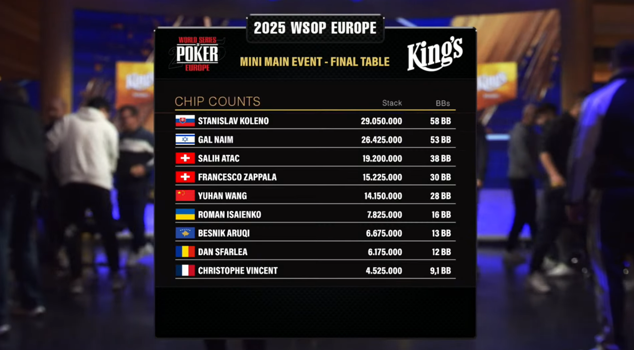 Netrvalo dlouho a po vyřazení Alkiviadise Stamatise na 10. místě jsme poznali účastníky finálového stolu. Na něj jako chipleader vstupoval zkušený slovenský hráč Stanislav Koleno, který je podle databáze HendonMob druhým nejúspěšnějším slovenským hráčem v historii. Následován byl Galem Naimem z Izraele a švýcarským hráčem Salih Atacem.