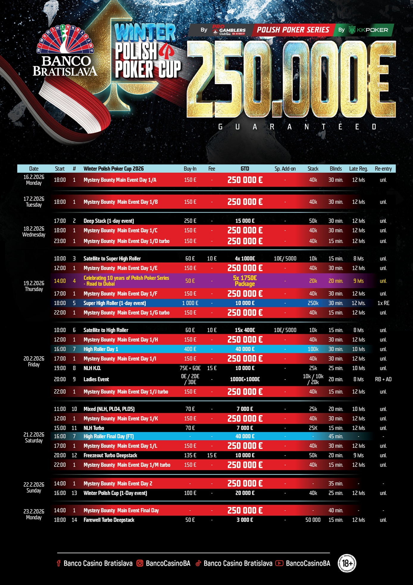 Winter Polish Poker Cup odstartoval včera rovnou Main Eventem s garancí 250.000€. Tentokrát se nejedná o klasický formát, ale o Mystery Bounty, ve kterém se v Day 2 budou rozdávat výhry i za vyřazení soupeře. Polovina prizepoolu se rozdělí mezi ty nejlepší a polovina bude ukryta v obálkách, kde tou největší výhrou bude 25.000€. V programu nebudou chybět ani prestižní Highrollery s garancí 10.000€ a 40.000€. Celý harmonogram turnajů Winter Polish Poker Cupu si můžete prohlédnout níže.