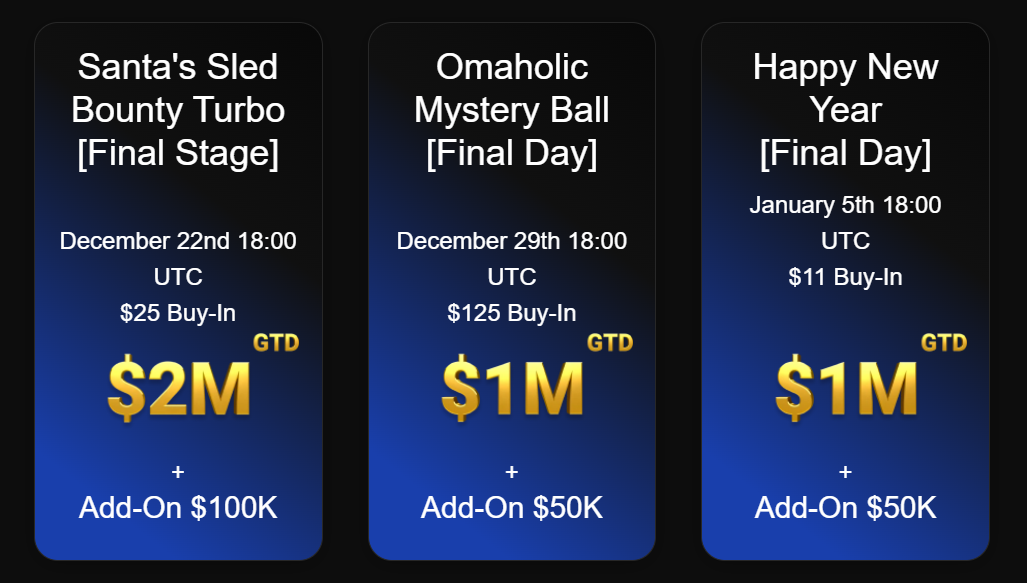 Highlights include $50 Winter is Coming 6-Max (Final Day) on Dec 15 with $50K added, $25 Santa’s Sled Bounty Turbo (Final Stage) on Dec 22 with $100K added, $125 Omaholic Mystery Ball (Final Day) on Dec 29 with $50K added, $11 Happy New Year (Final Day) on Jan 5 with $50K added, $54 Lucky Fortune Mystery Bounty (Day 2) on Jan 12 with $150K added, $32 Omaholic Bounty (Final Day) on Jan 19 with $25K added, and the closer: $250 Winter Giveaway Grand Finale (Day 2) on Jan 26 with $250K added.