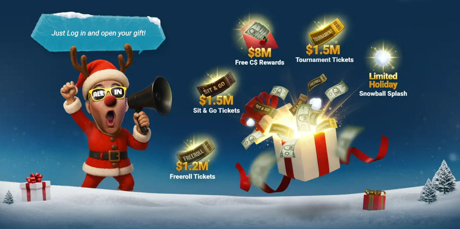 The festival’s 25.000.000$ prize pool is split into three huge pillars that cover every type of player. First comes the 12.000.000$ “12 Days of Christmas Gift Boxes”: log in any day between December 15 and December 26, open your Christmas Gift Box in the client and you’ll instantly receive a random reward. These can be C$ cash prizes, tournament tickets, freeroll entries or special “snowball” splash items that push extra value into your games – no buy-in, no grind requirement, just show up and claim.