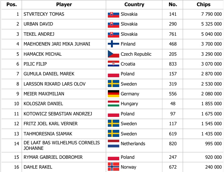 Yesterday, 110 players vied for a spot in the finals. Day 2 was filled with numerous seat openings until the list of the final sixteen was determined. Each player in this group is guaranteed €4,500, which they aim to convert into the top prize of €78,100. The largest stacks from yesterday's Day 2 were bagged by three Slovaks: Tomáš Štrvtecký, Dávid Urban, and Andrej Tekel. It will be intriguing to see if the Main Event title stays in Slovakia.