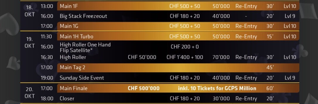 After five of the planned eight initial flights (1A to 1E), the CHF 500+50 GCPS Championship has already recorded 642 entries (474 unique players +168 re-entries), and the prize pool has grown to CHF 312,400. This represents nearly two-thirds of the guaranteed CHF 500,000, leaving around CHF 188,000 still required to meet the guarantee.