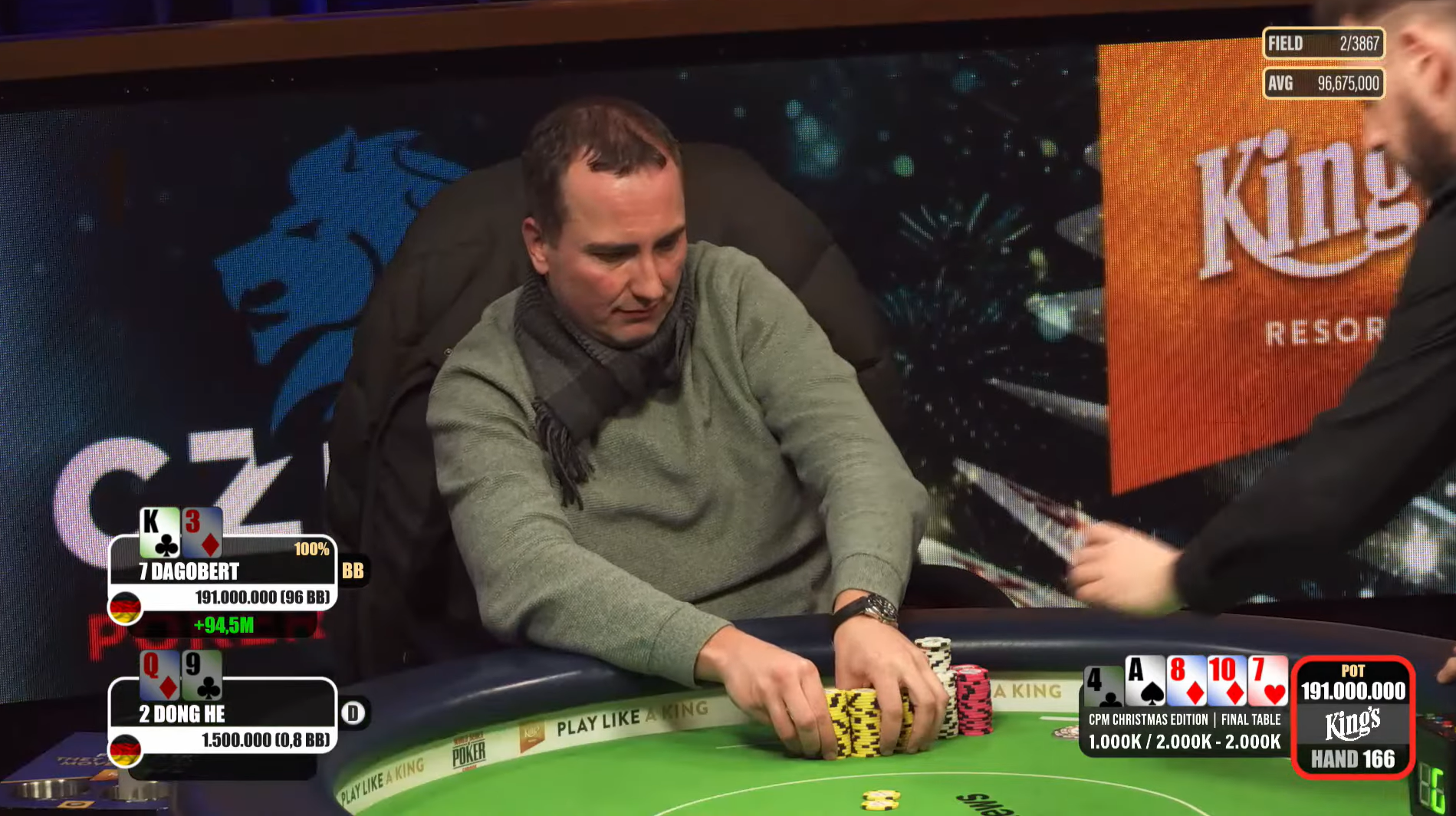 Dagobert secured the largest prize and the official champion title, walking away with €58,000 from Rozvadov. His fellow countryman, Dong He, finished in second. A key hand occurred when both had nearly identical stacks. Dong He went all-in with Q d 9 c, and Dagobert called with K c 3 d. The board 4 c A s8 d T d 7 h missed both players, leaving Dong He with less than one big blind, and he was eliminated two hands later.