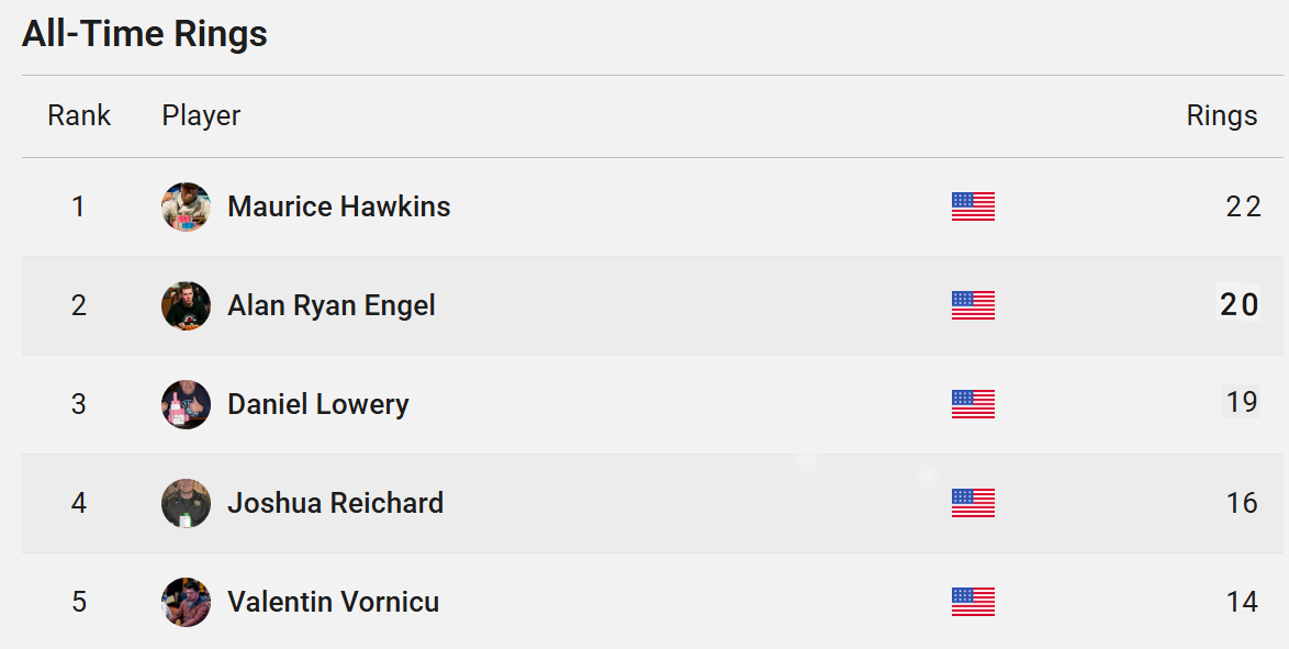 This triumph further solidified Hawkins' position atop the all-time WSOP Circuit ring leaderboard. He currently leads with 22 titles, with Ari Engel second at 20 and Daniel Lowery third at 19. While the race for the top spot once resembled a chess match with positions shifting monthly, Hawkins now holds a two-ring lead.