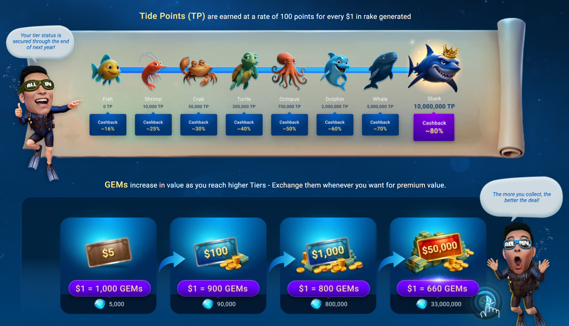 A: You earn Tide Points through play (published at 100 TP per $1 in rake generated) and accumulate GEMs whose value improves as you reach higher tiers.