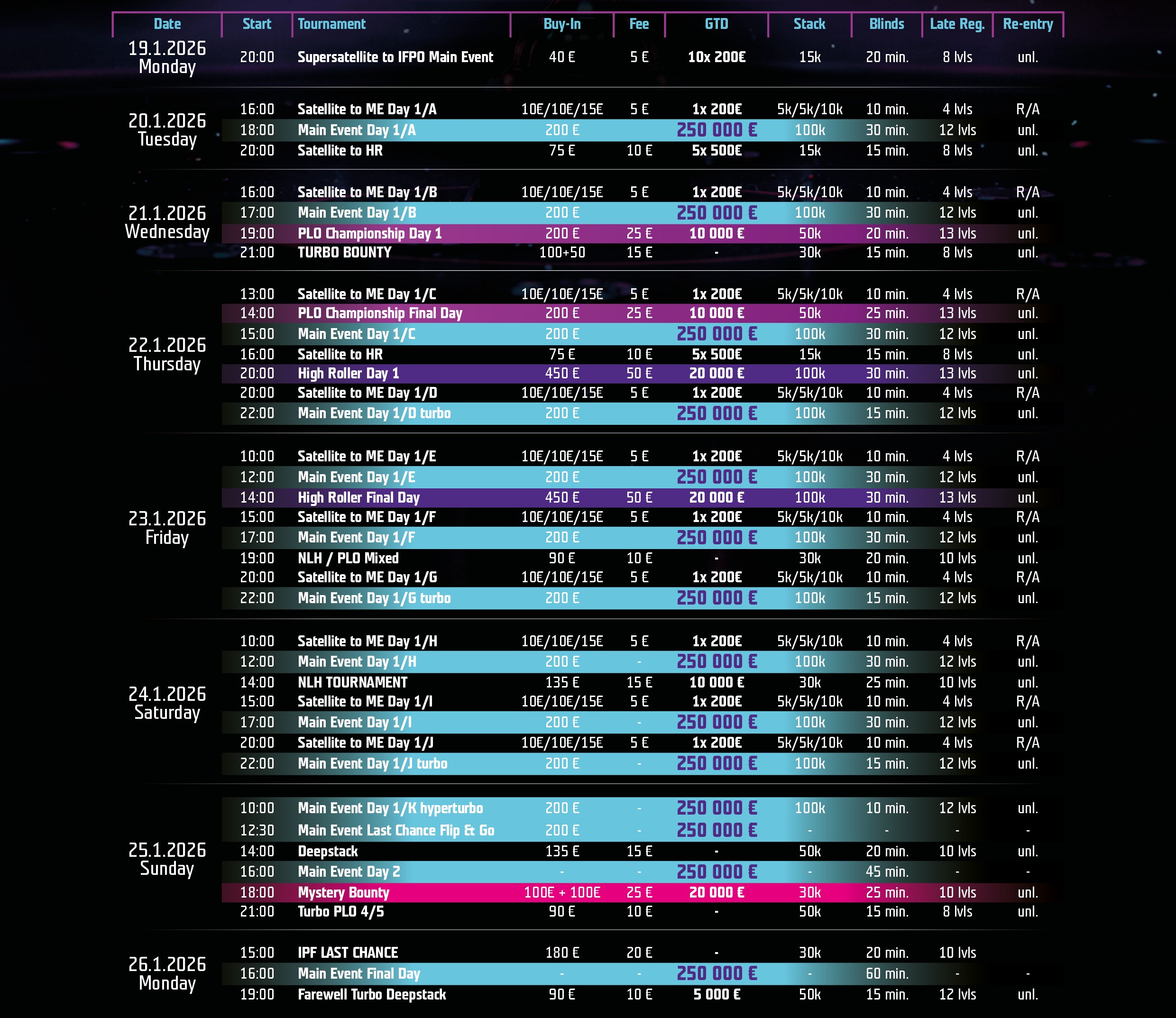 The packed schedule has plenty to offer for everyone. Fans of four-card play will enjoy the two-day PLO Championship with a €225 buy-in and a €10,000 guarantee. The popular Mystery Bounty format also makes an appearance with a €225 event boasting a €20,000 guarantee. For the most demanding players, there's the High Roller with a €500 buy-in and a €20,000 guarantee.