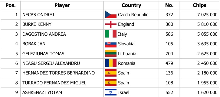 Mindegyik döntősnek végig kellett menetelnie az első és a második játéknapon, ahol összesen 63 játékos volt jelen. A tegnapi döntő napon kilenc finalista bontotta ki a stackjeit, és a legnagyobb mennyiségű zseton a cseh Ondrej Nečas birtokában volt.
