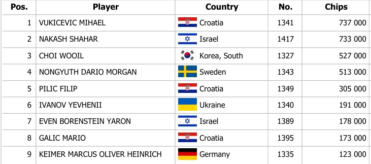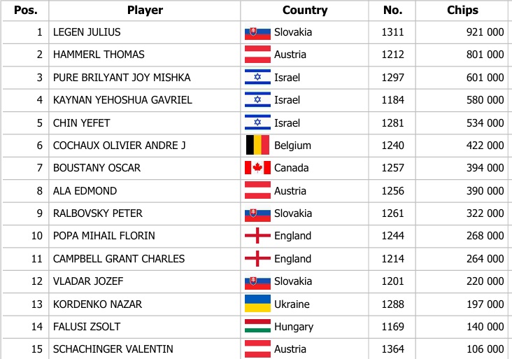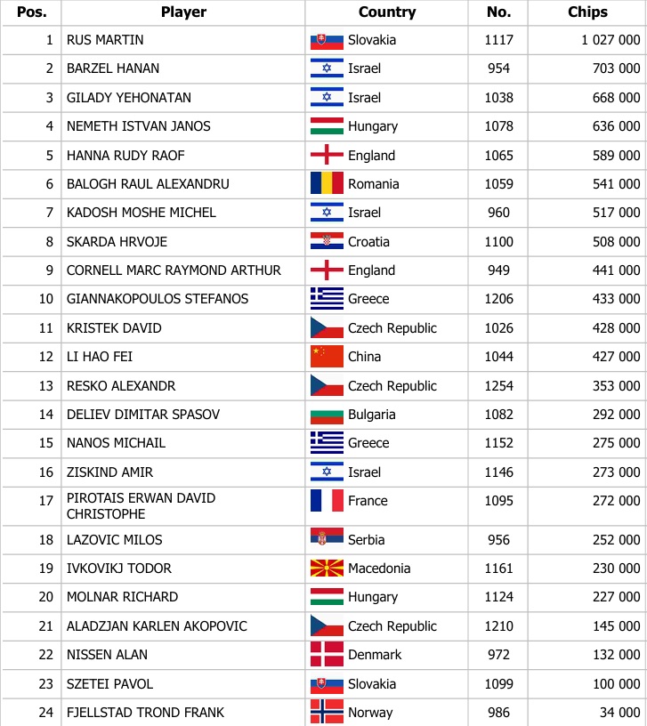 Tegnap volt a legerősebb játéknap. Szombaton három flight is volt a programban, ahol a játékosok biztosíthatták a továbbjutásukat a 2. napra. Ezen a három flighton összesen 7.800 € került kiosztásra a chipleader bónuszokban.