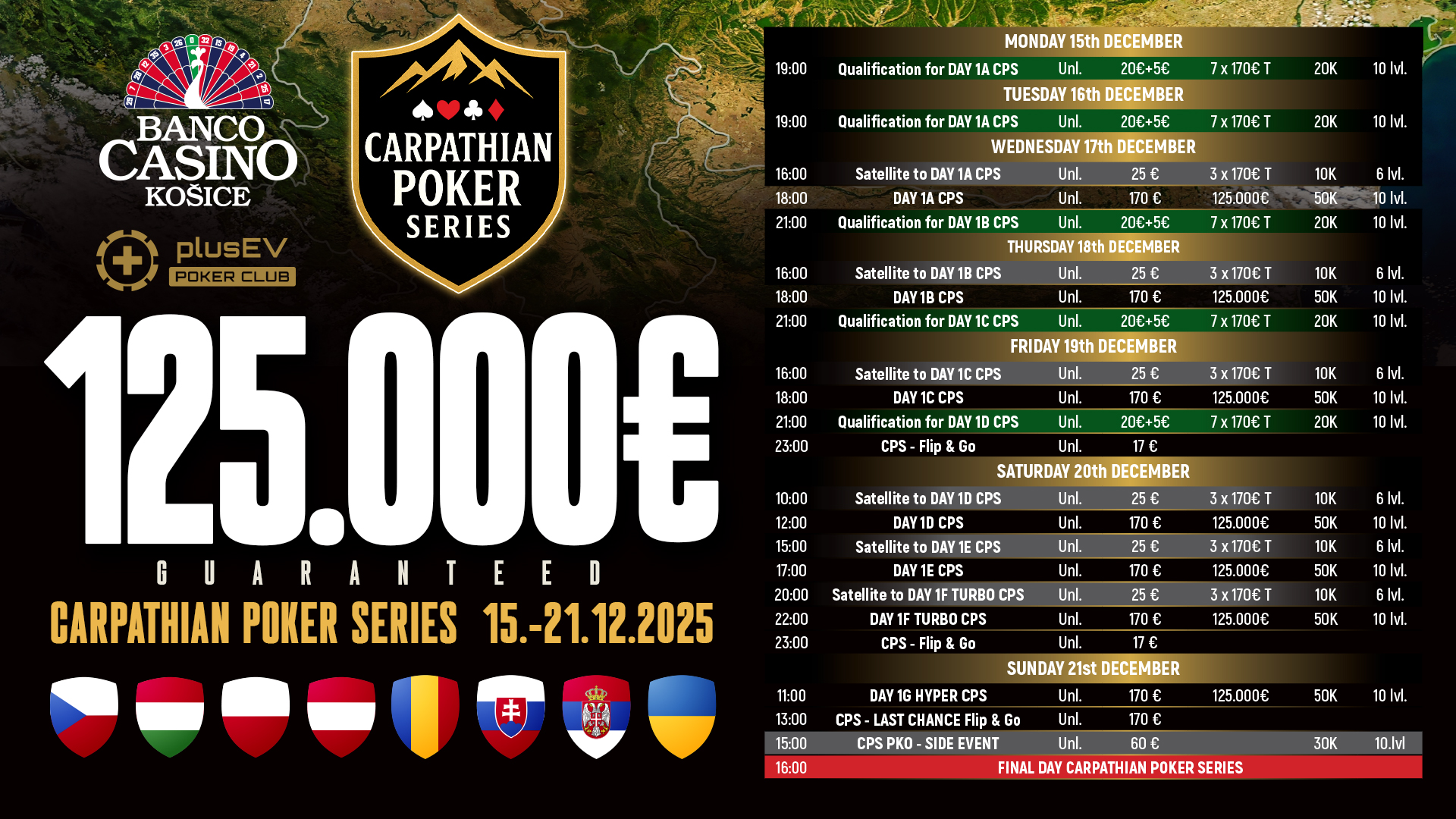 A Banco Casino Košice az év végére igazi pókerkülönlegességgel készült játékosai számára a Carpathian Poker Series formájában, amely 125.000€ összgaranciát kínál. A Main Event december 17-én szerdán kezdődik, és a bajnokot már ezen a vasárnapon, december 21-én megismerjük.