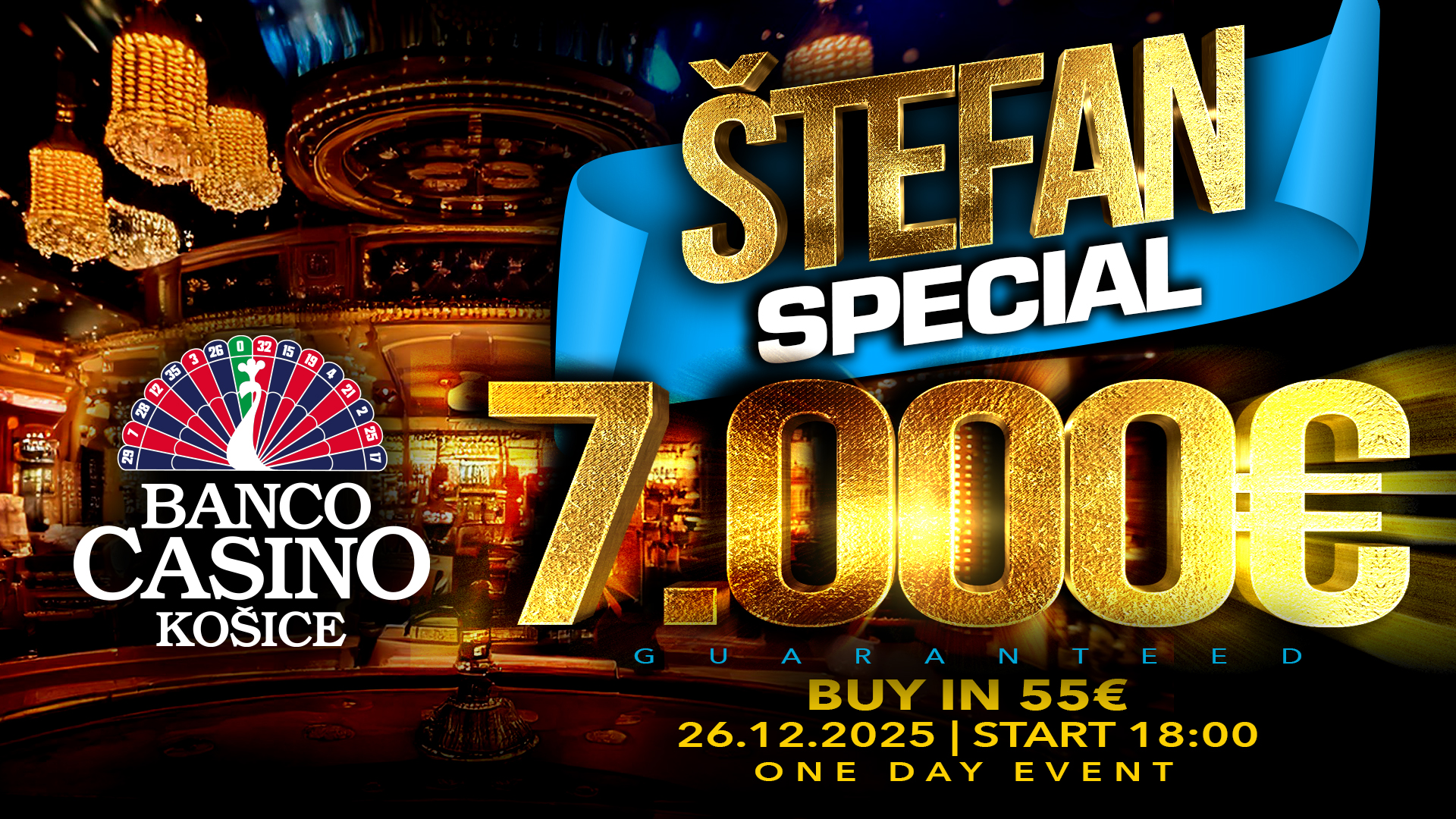 A Banco Casino Košice versenyei az ünnepek között is folytatódnak. Ahogyan már megszokhattuk, december 26-án kerül megrendezésre a Szent István Speciál, 7.000€-s garanciával és 55€-s nevezési díjjal. A torna 18:00 órakor kezdődik, a regisztráció pedig 12 szintig nyitva marad, amelyek mindegyike 25 perces lesz.