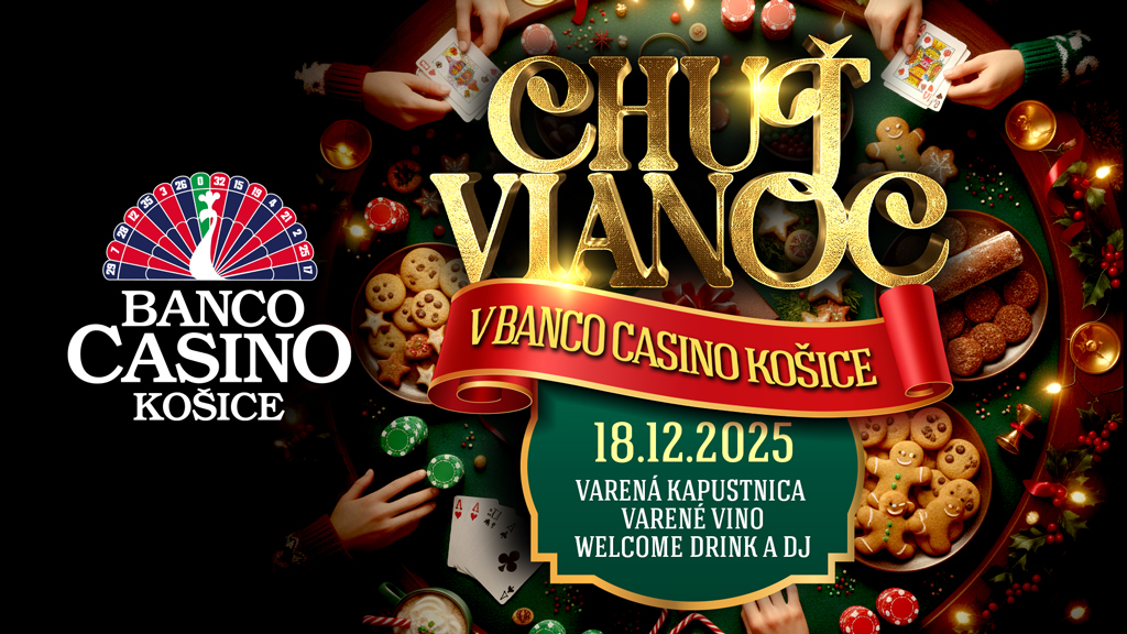 Igazi karácsonyi hangulatot is átélhetünk a Banco Casino Košicében, hiszen december 18-án a "Karácsony ízei" nevű esemény keretében megízlelhetjük a főtt káposztalevest, forralt bort és más üdvözlő italokat. A szórakozásról DJ gondoskodik, aki a megfelelő hangulatba hoz bennünket.