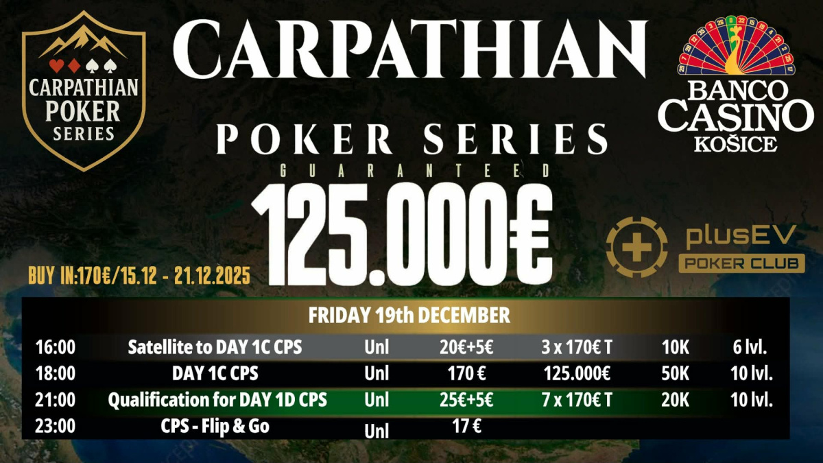 Ma folytatódik a Carpathian Poker Series fő eseménye a harmadik kezdő játéknappal, ezúttal a 1C megjelöléssel. A Banco Casino Košice 18:00 órakor nyitja meg kapuit minden pókerrajongó előtt, amikor is megkezdődnek a harcok a további továbbjutó helyekért. A garanciában még mindig körülbelül 106.000 euró hiányzik, ezért ezt a tornát nem szabad kihagyni.