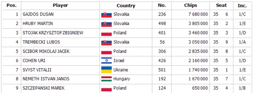 Kilenc órányi izgalmas játék után kialakult a döntő asztal mezőnye. A lengyel Jendrek maradt le utolsóként, aki a tizedik helyért 857€-t vihetett haza. A döntő asztal chipleadere a hazai Dušan Gajdoš lett 7.680.000 zsetonnal, ami kétszerese volt a második helyezett Martin Hrubého stackjének.