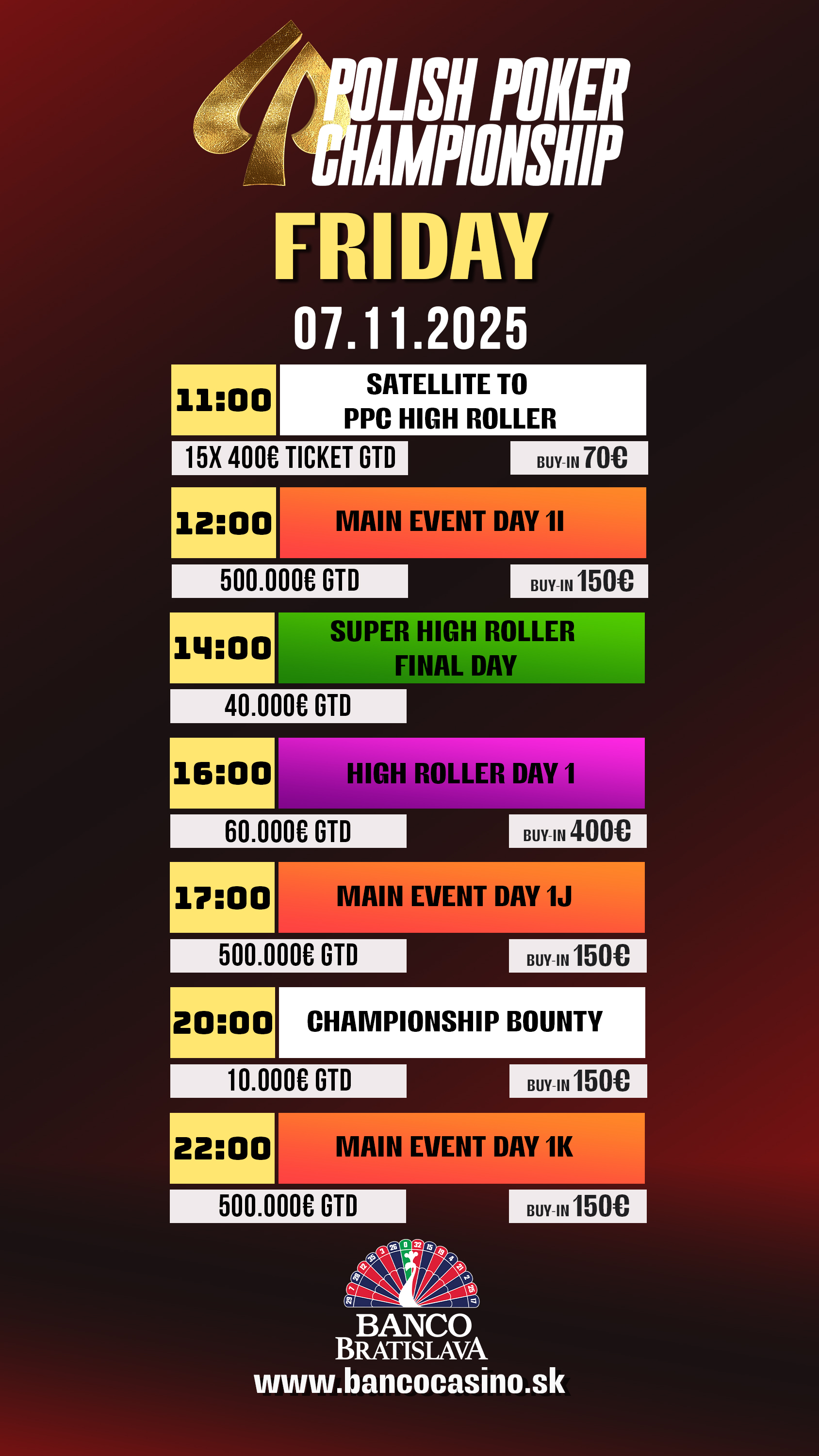Ma az említett három Main Event flight kerül megrendezésre, kezdés 12:00, 17:00 és 22:00 órakor. Ezt követi a Highroller 16:00 órakor, melynek buy-inje 400€, és 60.000€-ot garantálnak. 20:00 órakor pedig a Championship Bounty tornára kerül sor, 10.000€ garanciával és 150€ buy-in mellett.