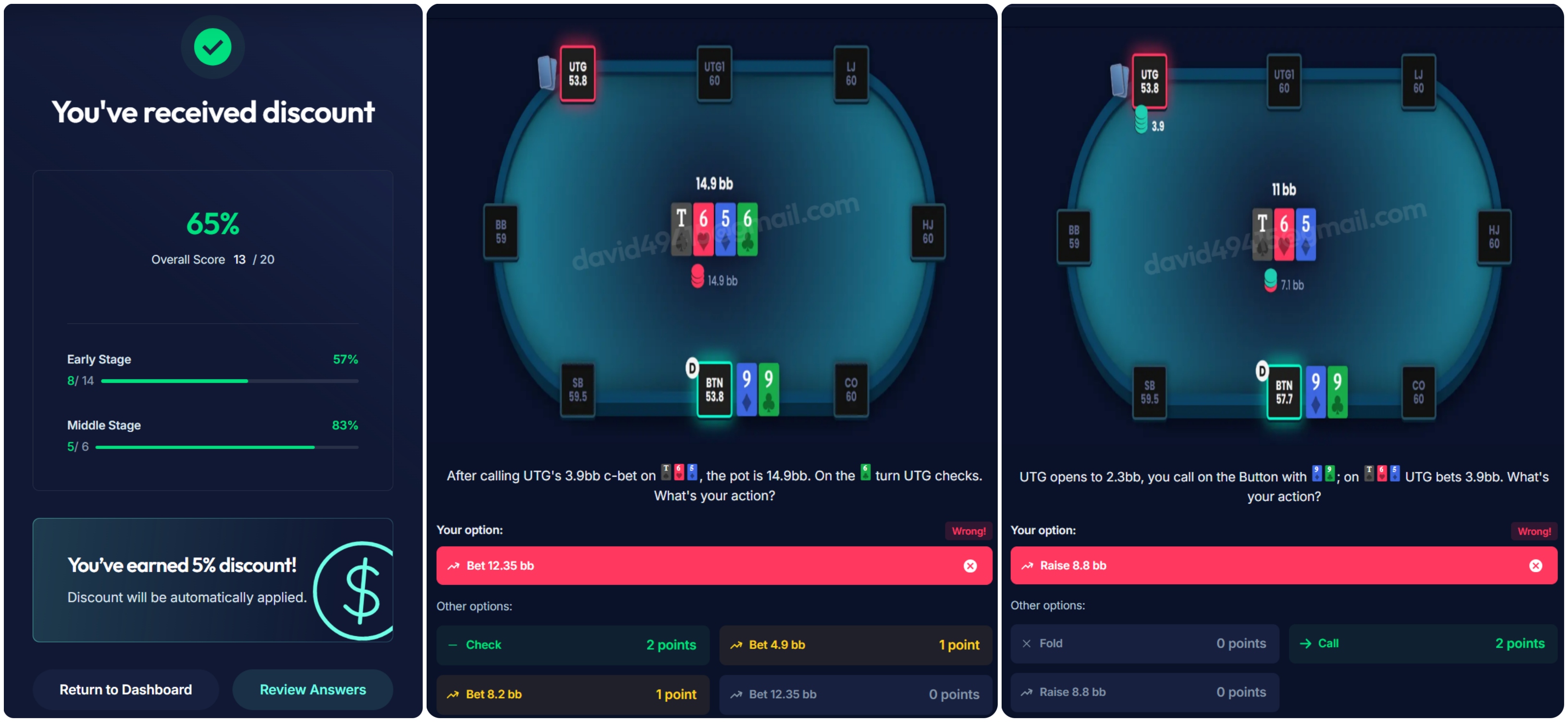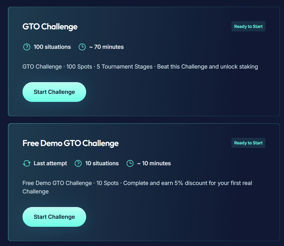 Mielőtt belevágsz a kihívásba, javasoljuk, hogy próbáld ki a Demo kihívást. Ez 10 GTO szituációt tartalmaz, megismerkedhetsz a folyamattal, és visszajelzést is kapsz a gyenge pontjaidról, valamint 5% kedvezményt az éles kihívásra.