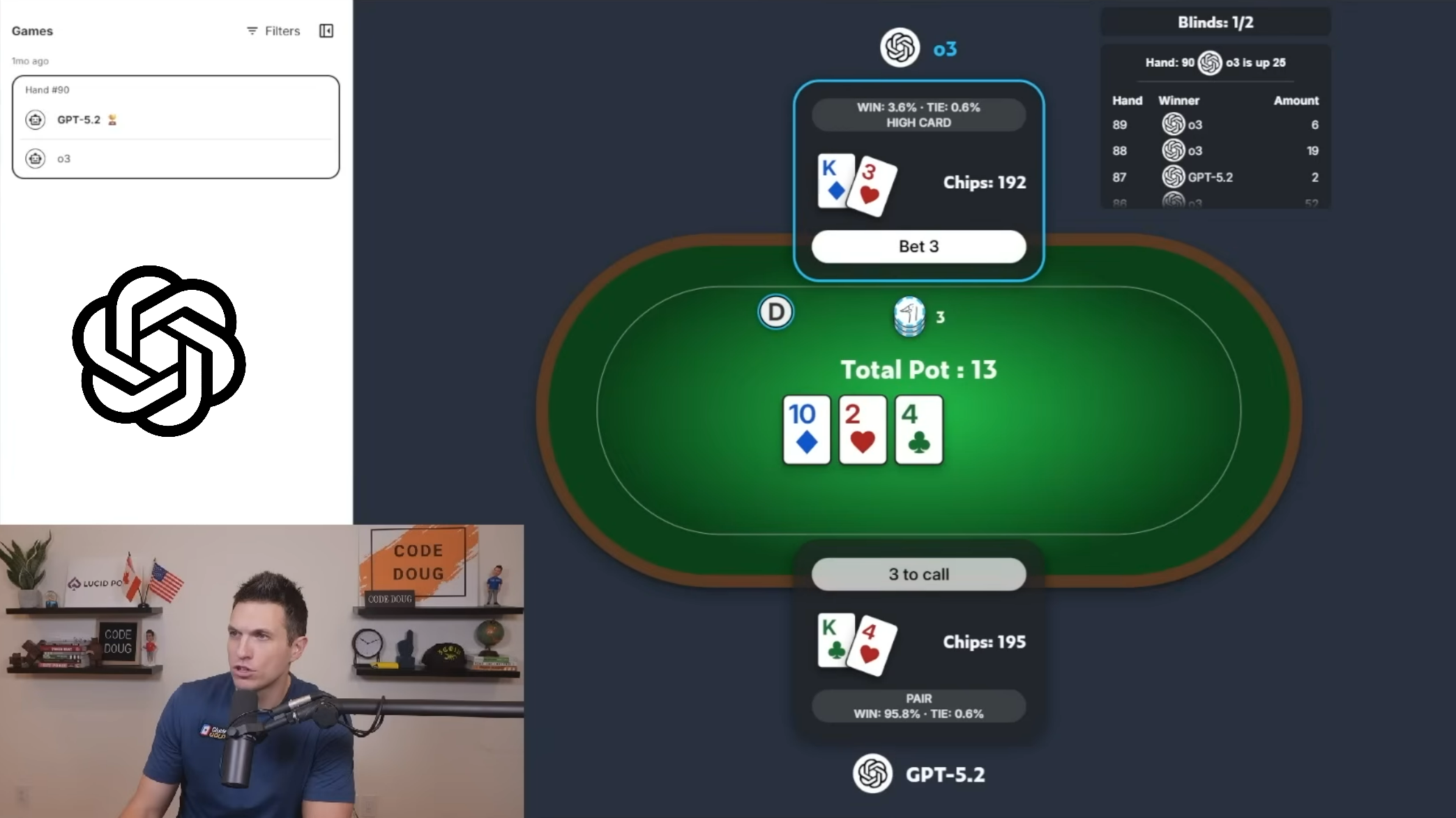 V pokrovej časti Game Areny sa modely testovali v heads-up NLHE a práve GPT-5.2 mal byť najziskovejším účastníkom. V správach sa objavilo konkrétne číslo: približne 180.000 odohraných rúk na blindoch 1$/2$ a výsledný profit 167.614$. V praxi ide o “simulovaný cash game” benchmark, ktorý má ukázať, ako sa model správa v hre s neúplnou informáciou – teda presne v prostredí, kde nestačí byť len dobrý v počítaní kombinácií, ale je potrebné aj správne vyhodnocovať rozsahy, frekvencie a načasovanie agresie.