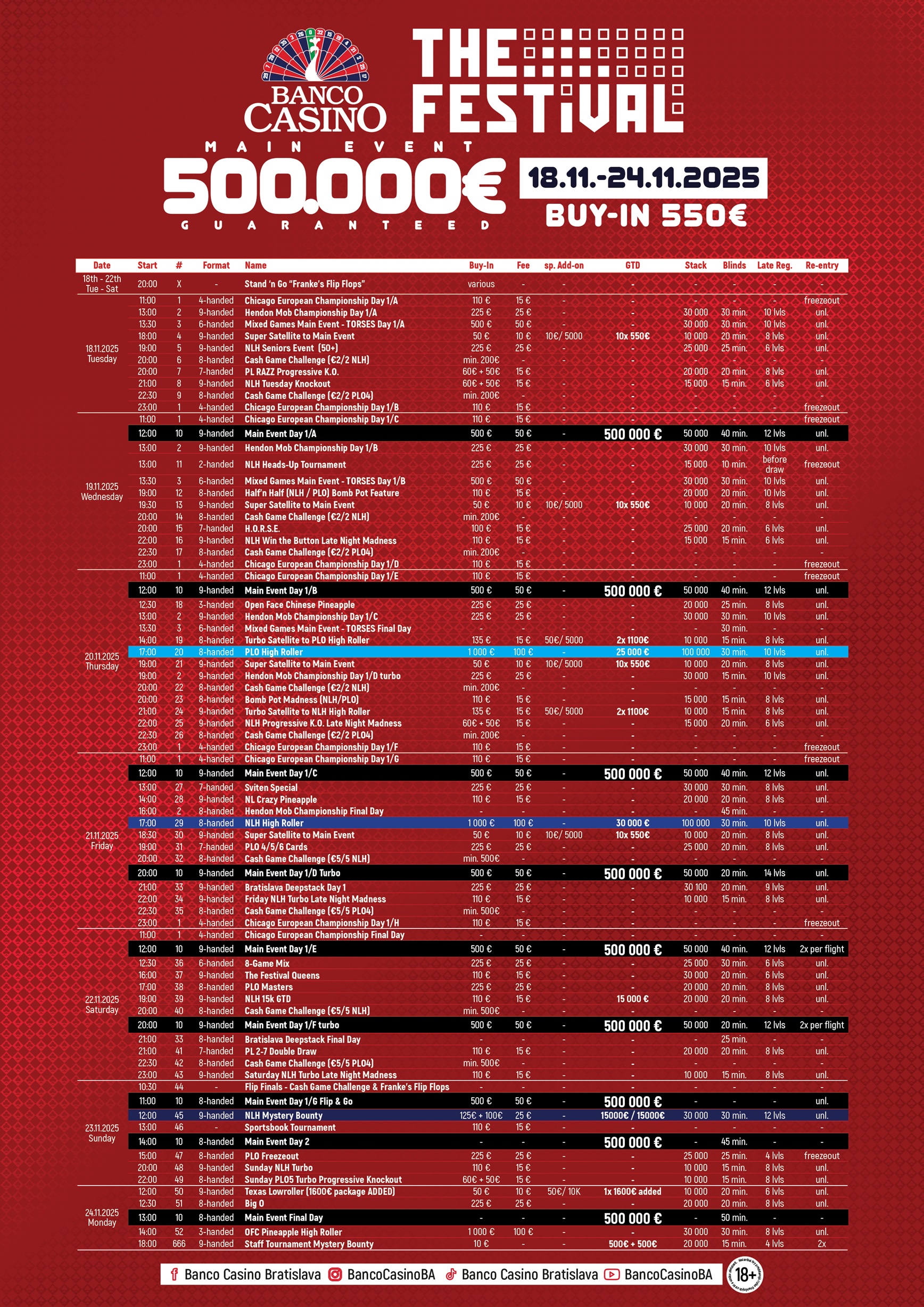 The Festival so sebou prinesie do Banco Bratislava skvelú atmosféru plnú zábavy, Nebude chýbať ani atraktívny harmonogram, ktorý poteší nejedného milovníka pokru. Všetci hráči si prídu na svoje, keďže budú k dispozícii turnaje vo všetkých možných variantoch pokru. Do Bratislavy smeruje niekoľko pokrových výprav z rôznych kútov sveta a to znamená, že bude postarané o nepretržitú akciu v turnajovej i v cash game zóne.