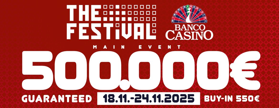 V Banco Bratislava štartuje populárny The Festival 2025 a s ním aj highlight celého eventu - Main Event. Ten prinesie krásnu pol miliónovú garanciu za 550€ vstupné. Štruktúra Main Eventu so sebou priniesla aj jednu zmenu a to, že z každého flightu postúpi 12,5% hráčov do Day 2 a každý z postupujúcich bude maž istotu peňazí.
