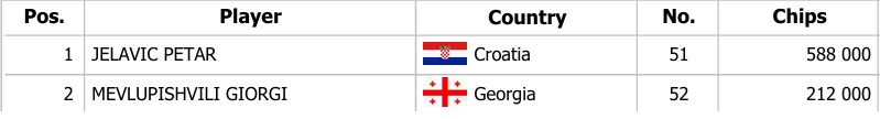 Včera sa odohral flight s označením 1C, do ktorého naskočila len hŕstka hráčov. Celkovo sa hráči do turnaja zaregistrovali iba 16 krát z čoho vyústili dve postupové miestenky do finále. Petar Jelavic z Chorvátska si zabalil 588.000 chipov a Giorgi Mevlupishvili z Gruzínska zas 212.000 chipov.