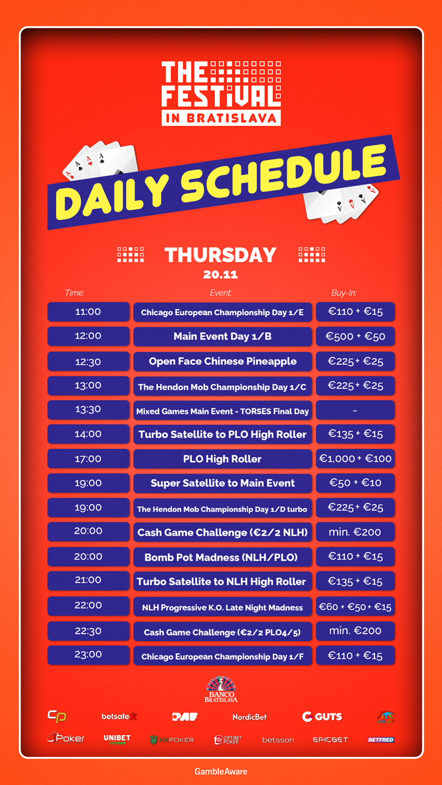 Piate vydanie The Festivalu v Banco Bratislava naberá na sile. Dnes prinesie až 12 turnajov vrátane PLO High Rollera s garanciou 25.000€ so vstupným 1.100€. Taktiež budú pripravené dva flighty Main Eventu, ale aj flight 1C The Hendonmob Championshipu. Celý dnešný harmonogram si môžete pozrieť nižšie.
